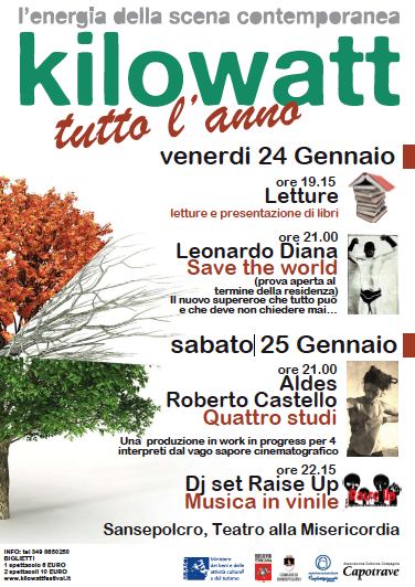 Venerdì 24 e sabato 25 gennaio a Sansepolcro, si terrà il secondo week-end del progetto “Kilowatt tutto l’anno” nel nuovo Spazio Ex Misericordia di Sansepolcro.